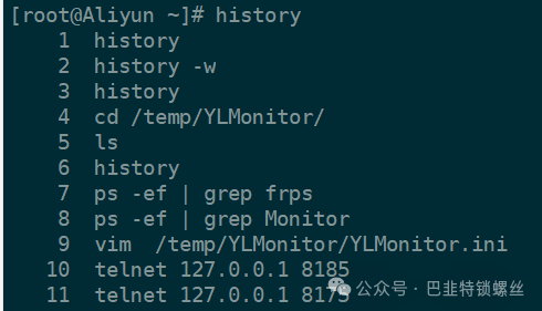[root@Aliyun ~]# cat ~/.bash_historyhistoryhistory -whistorycd /temp/YLMonitor/lshistoryps -ef | grep frpsps -ef | grep Monitorvim /temp/YLMonitor/YLMonitor.initelnet 127.0.0.1 8185telnet 127.0.0.1 8175docker psdocker ps -afree -mls