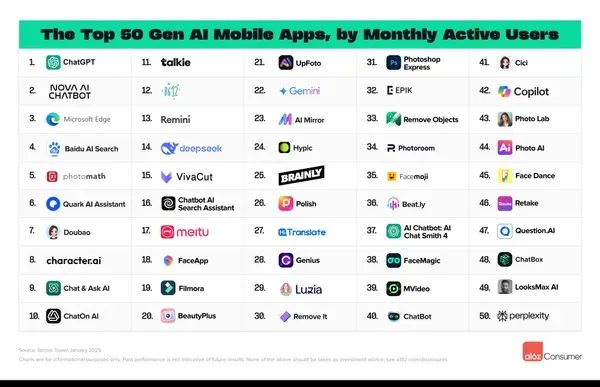 硅谷知名公司 a16z 近日发布了 2025 年百大 AI 应用程序排名,包括网页端产品和 APP 产品各 50。