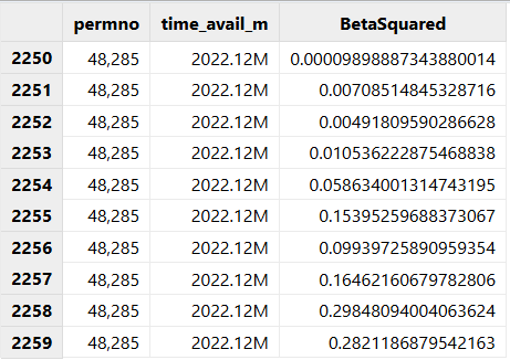 result = calcBetaSquared(prepareMonthlyCRSP(monthlyCRSP),prepareMonthlyFF(monthlyFF),prepareMonthlyMarket(monthlyMarket),startTime=1987.01M,endTime=2023.12M)