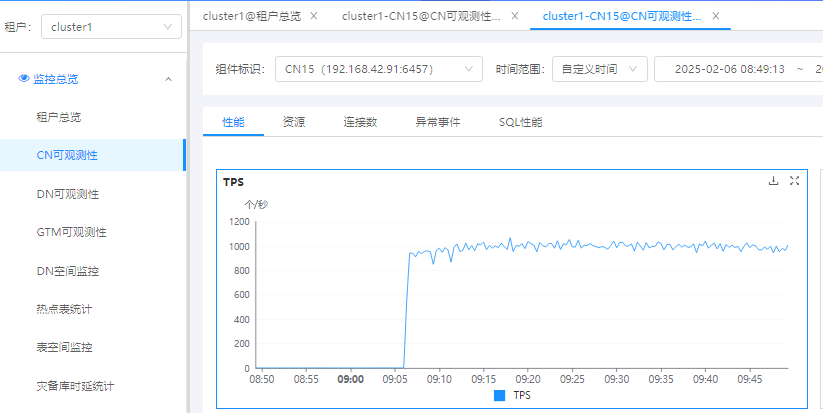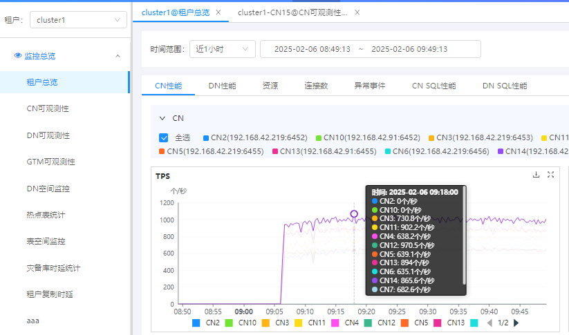 总分结构:进入页面先展示租户总览,它是租户总体监控信息的集中展示。总览下面放置CN可观测性、DN可观测性、GTM可观测性三个页面,是子模块监控总览。在租户层面发现的线索,可以下钻到具体的组件可观测性页面进一步分析。