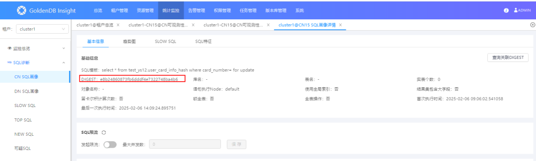 在租户总览的SQL性能页面,点击某digest(如图5),会跳转到对应的SQL画像页面,并根据digest进行查询,展示该digest的基本信息(如图6)。