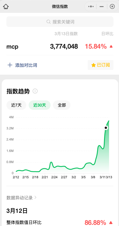 上周 Manus 刷屏后,马上各种 Manus 复刻快速涌现,进而把 MCP (Model Context Protocol) 这个相对低调的技术带出了圈。从微信指数上就能看到,MCP 在中国的热度短时间内就飙升到了最高的 100。