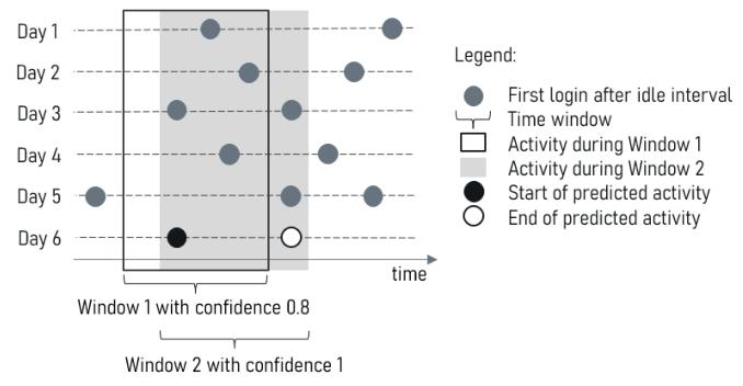 对于每个时间窗口,算法计算该窗口内用户活动的概率。具体来说,算法会统计历史数据中每个窗口内用户活动的次数,并将其除以总的历史天数。如果某个窗口的活动概率超过设定的阈值(如0.1),则认为该窗口内的活动是可预测的。例如,如果在过去28天内,某个窗口内用户活动的概率为0.8,则该窗口内的活动被认为是高概率事件。