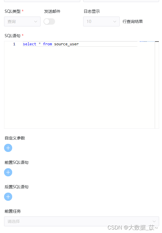 在SQL任务的配置页面中,我们需要设置以下几个关键参数:数据源:选择MySQL。数据源实例:选择刚才新增的MySQL实例 查询:
