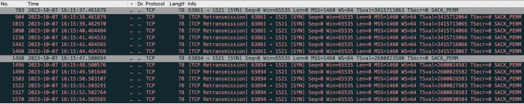 IP访问控制的原理很简单,对于非白名单的IP进行拦截;具体的表现即客户端通过TCP/IP协议发出的SYN请求不会收到任何的回复。在当前的物理机上可以看到一个没有白名单的物理机再发送完SYN后不停的发送Retransmission重传请求,这说明IP拦截可以在TCP/IP协议的第一步将访问拦截。