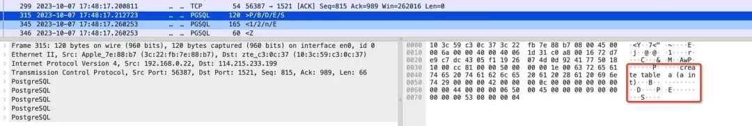 例如以下场景,用户希望创建一张表 create table a 这样的结果在链路上抓包以后可以反编译出原始的查询内容。