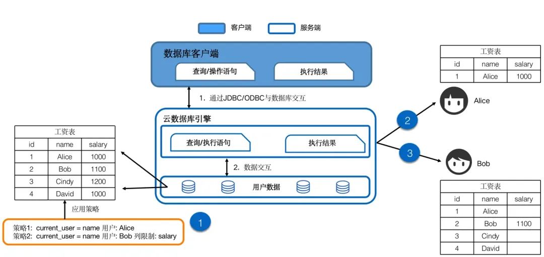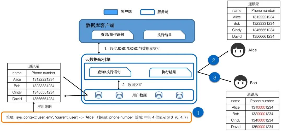以上图为例,Alice可以像普通表一样读到真实的数据,而Bob只能读到脱敏后的数据。