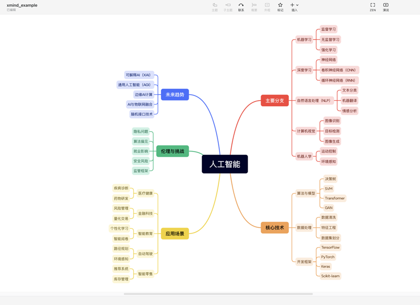 读者可以根据需要进行进一步的编辑和美化,这样我们就完成了用DeepSeek + Xmind一键生成思维导图。
