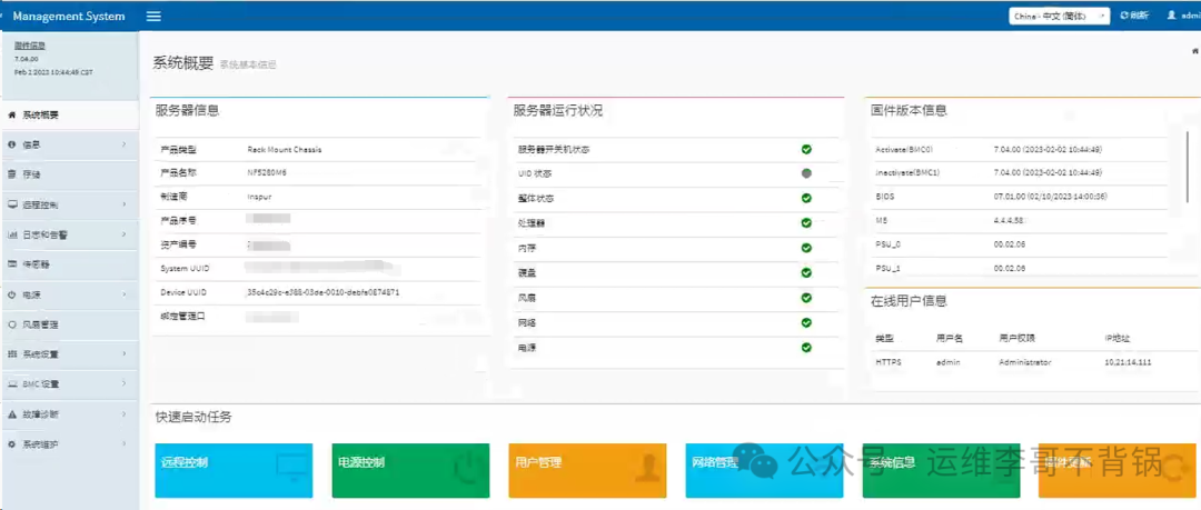 Inspur ISM(浪潮):浪潮服务器的远程管理平台,支持IPMI、Redfish、SNMP等协议,实现全面的远程维护能力