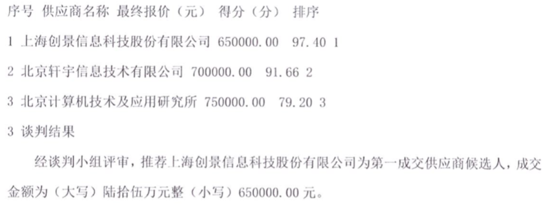 1、中标候选人基本情况中标候选人第1名:上海创景信息科技股份有限公司,投标报价:65.00万元,质量:满足采购文件要求,交货期签订合同6个月内完成部署及项目验收,工期/交货期/服务期:0天: