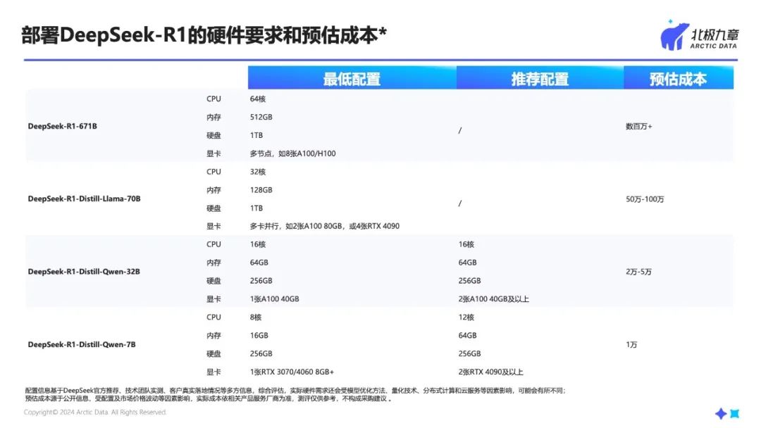 我们基于DeepSeek官方推荐、技术团队实测、客户真实落地情况等多方信息,综合评估推荐部署DeepSeek-R1各版本模型的硬件配置和成本。