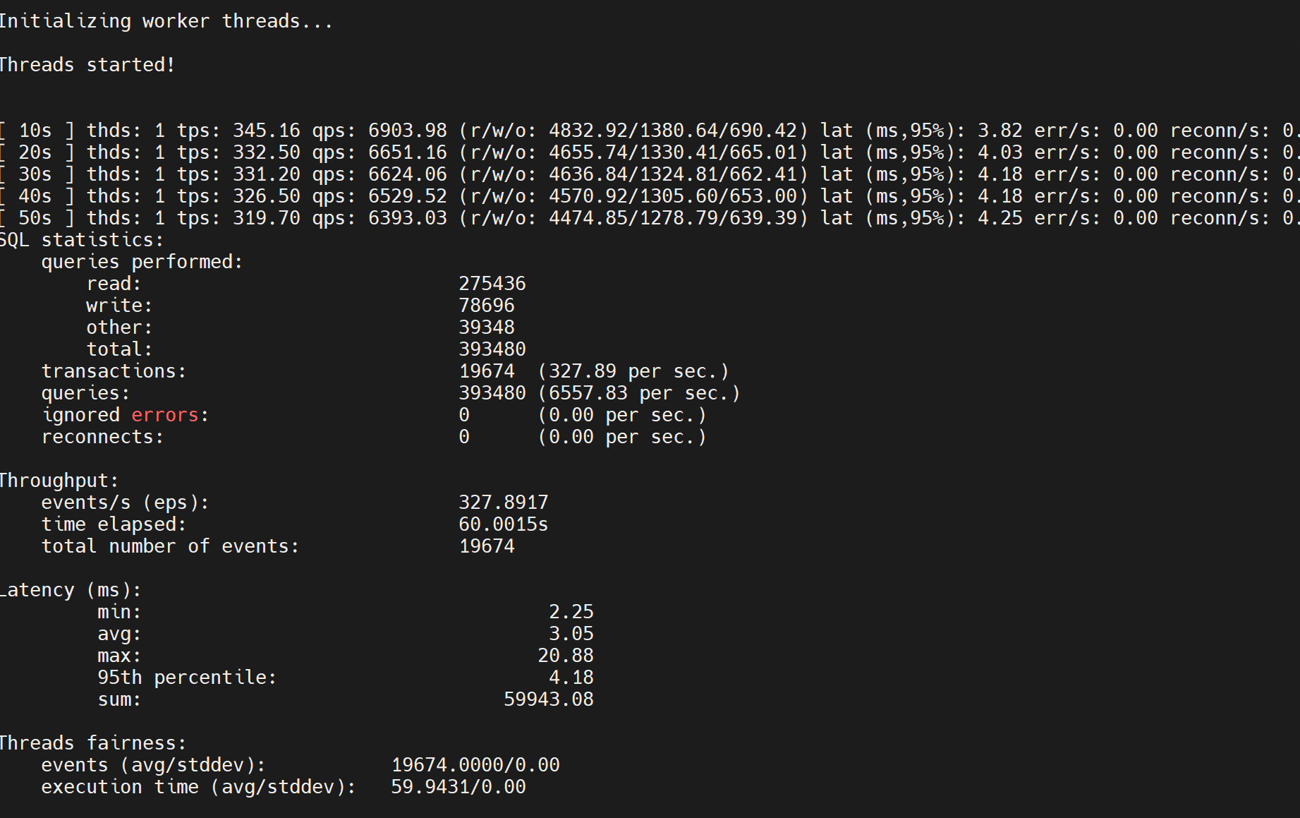 transactions: 19674 (327.89 per sec.) -- 总事务数(每秒事务数)
