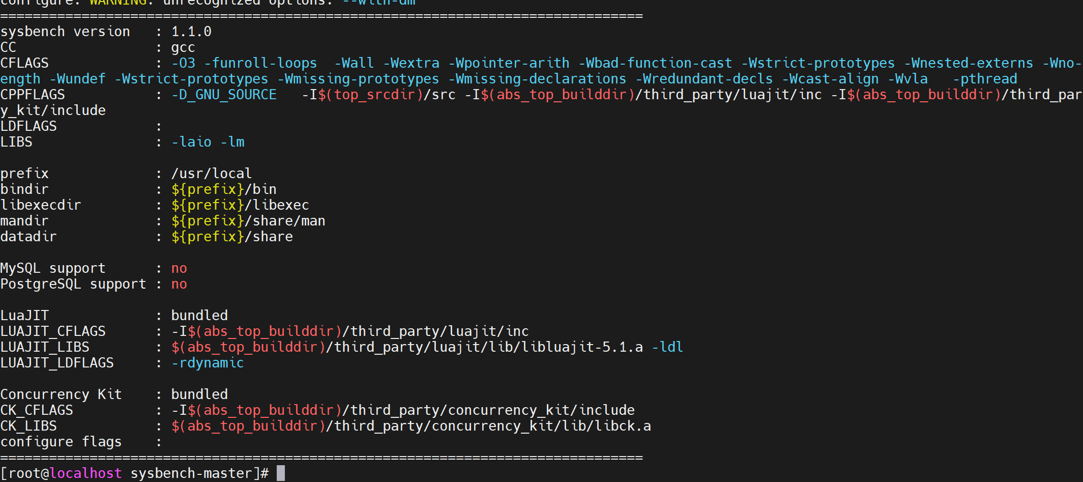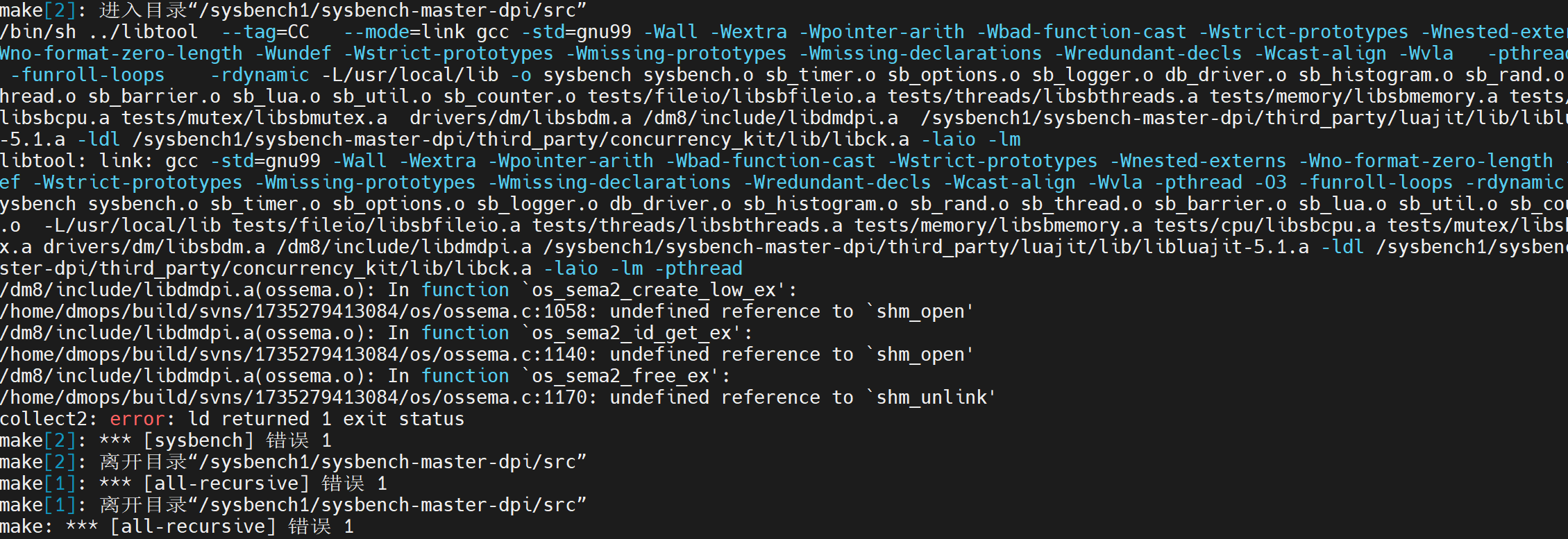 gcc -std=gnu99 -Wall -Wextra -Wpointer-arith -Wbad-function-cast -Wstrict-prototypes -Wnested-externs -Wno-format-zero-length -Wundef -Wstrict-prototypes -Wmissing-prototypes -Wmissing-declarations -Wredundant-decls -Wcast-align -Wvla -pthread -O3 -funroll-loops -rdynamic -o sysbench sysbench.o sb_timer.o sb_options.o sb_logger.o db_driver.o sb_histogram.o sb_rand.o sb_thread.o sb_barrier.o sb_lua.o sb_util.o sb_counter.o -L/usr/local/lib tests/fileio/libsbfileio.a tests/threads/libsbthreads.a tests/memory/libsbmemory.a tests/cpu/libsbcpu.a tests/mutex/libsbmutex.a drivers/dm/libsbdm.a /dm8/include/libdmdpi.a /sysbench1/sysbench-master-dpi/third_party/luajit/lib/libluajit-5.1.a -ldl /sysbench1/sysbench-master-dpi/third_party/concurrency_kit/lib/libck.a -laio -lm -pthread -lrt