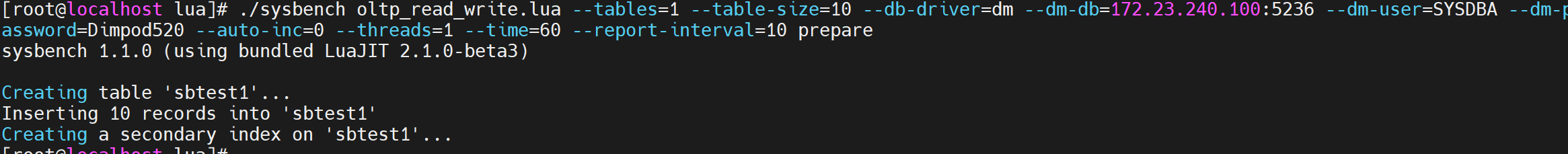 ./sysbench oltp_read_write.lua --tables=1 --table-size=10 --db-driver=dm --dm-db=172.23.240.100:5236 --dm-user=SYSDBA --dm-password=Dimpod520 --auto-inc=0 --threads=1 --time=60 --report-interval=10 preparee