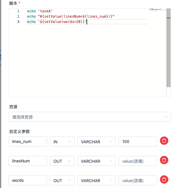 [INFO] 2024-07-05 10:09:54.539 +0800 - Set taskVarPool: [{"prop":"linesNum","direct":"IN","type":"VARCHAR","value":"100"},{"prop":"words","direct":"IN","type":"VARCHAR","value":"20"}] successfully