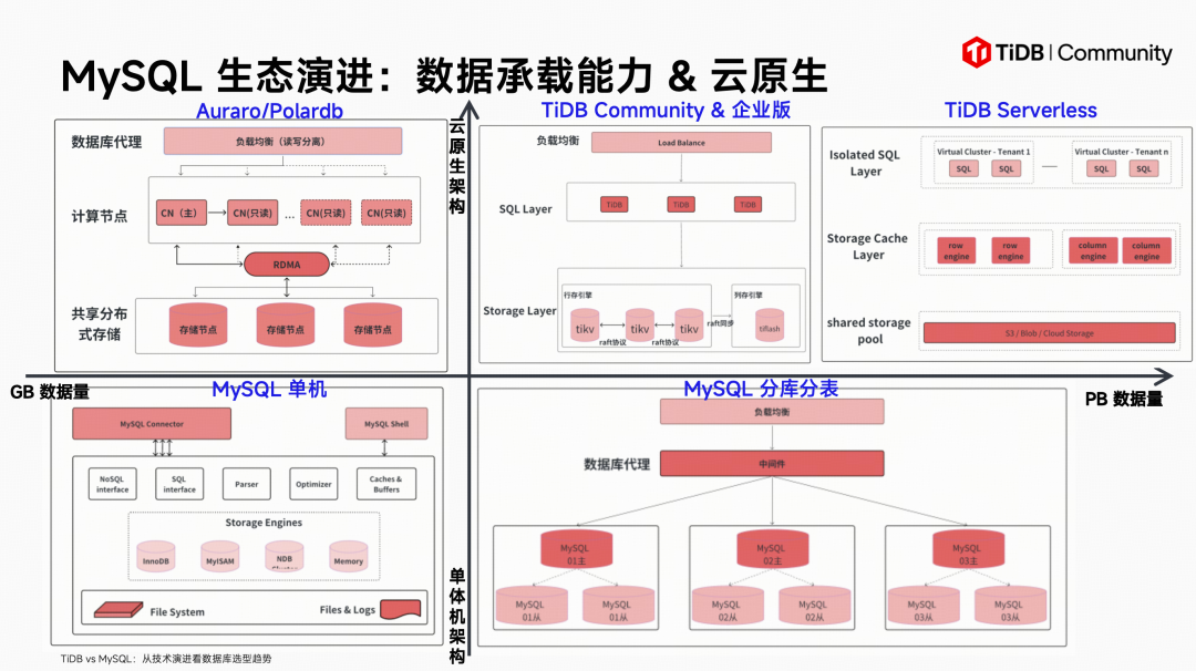 云原生部署:MySQL 最初以单体机架构部署,后来发展到 RDS(关系型数据库服务)。随后,出现了以 Auraro、PolarDB 为代表的基于共享分布式存储的云原生架构。然而,这些架构在吞吐扩展和数据承载能力上存在局限。为满足更高需求,用户逐渐转向 TiDB Cloud,它们具备更强大的云原生能力,能更好地适应复杂多变的云计算环境。