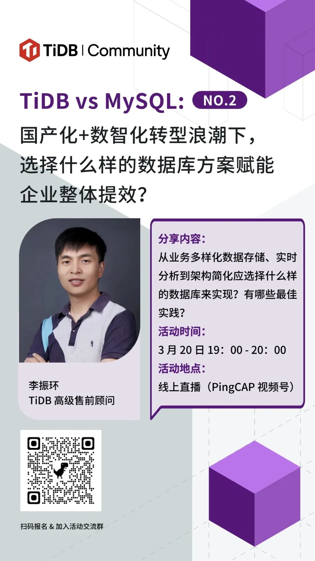 📣 3 月 20 日晚“TiDB vs MySQL 系列 Meetup” 第二讲即将在 PingCAP 视频号开启!