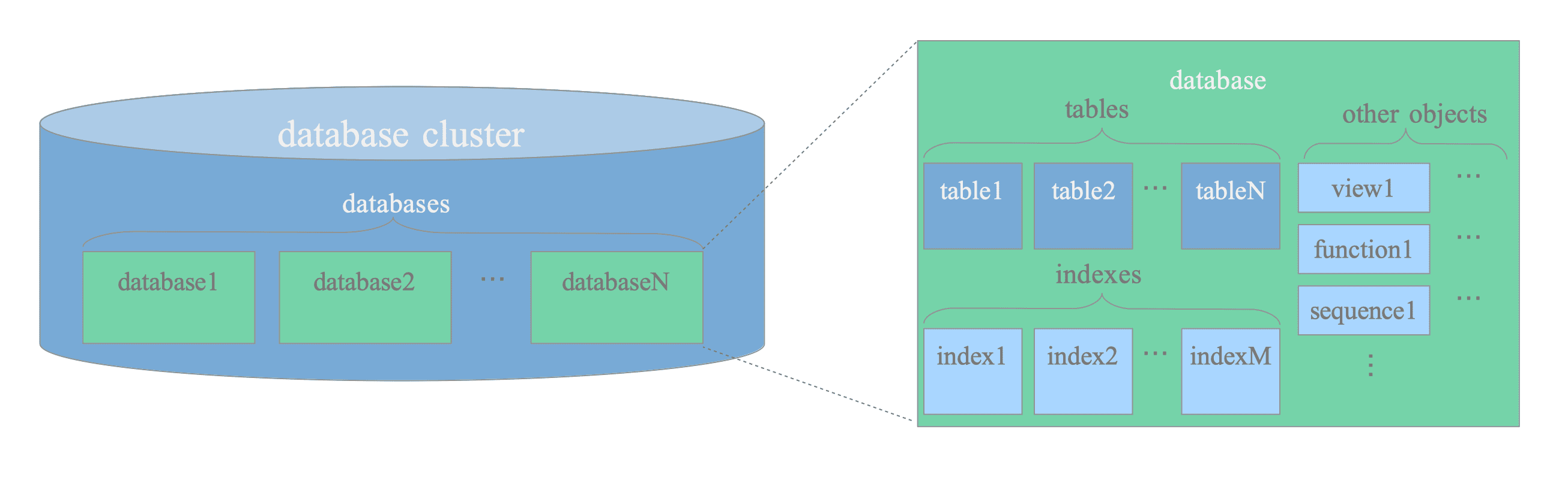Figure 1.1 shows the logical structure of a database cluster. A database is a collection of database objects. In the relational database theory, a database object is a data structure used to store or reference data. A (heap) table is a typical example, and there are many others, such as indexes, sequences, views, functions. In PostgreSQL, databases themselves are also database objects and are logically separated from each other. All other database objects (e.g., tables, indexes, etc) belong to their respective databases.