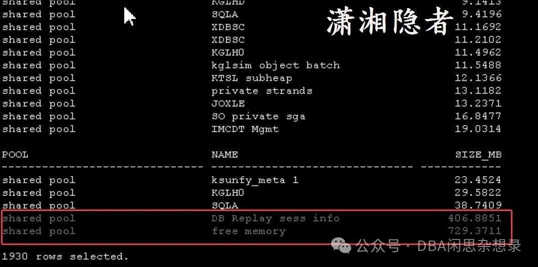 检查SGA组件,发现有大量DEFAULT buffer cache收缩(SHRINK)和shared pool增长(GROW)的记录,进一步查询share pool内存空间信息发现, shared pool里面的"DB Replay sess info"和"free memory"两个子组件占用了最多内存,如下截图所示