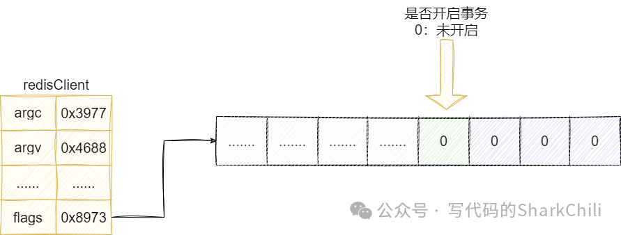 这一点我们也可以从源码的角度分析,redis会为每一个redis客户端分配一个结构体维护其内部信息,这其中flag字段就代表着客户端各种状态标识,这其中低3位就表示客户端是否开启事务标识,如果1就代表开启,反之代表未开启: