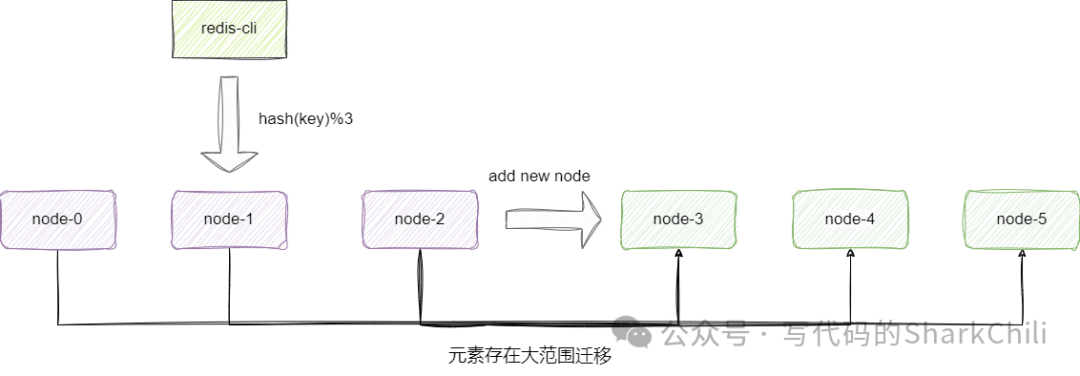 这种解决方案的缺陷也很明显,如上所说进行扩容看你会导致部分数据无法命中,所以我们还是需要手动针对附近区域的缓存数据进行迁移管理,并且为了保证均匀的集群拓展,我们还是需要考虑增加1倍的节点,才能保证数据负载均衡。