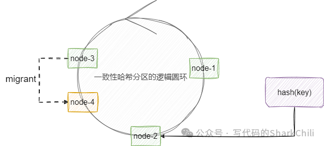 这种方案在进行扩容时,我们只需考虑在环上增加一个逻辑节点,影响面也仅仅是相邻的节点,例如我们在node-2