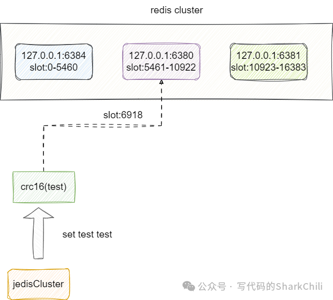 例如我们现在有3个节点,槽位换算后的区间如下所示,我们用redis客户端插入一个节点的过程大体如下所示,即通过crc16这个高质量算法定位得到一个slot