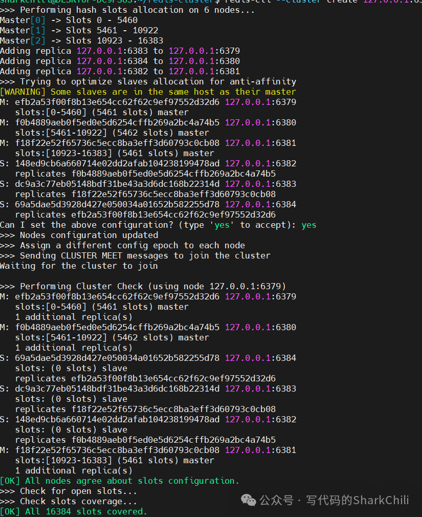 最后我们键入下面这段指令让集群自动选出master并为每个master节点分配一个从节点: