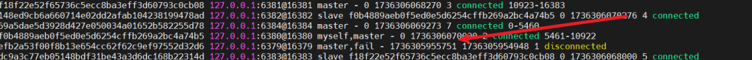 当然java主流开源工具对于这种问题都做好了优化,即在客户端工具类启动时通过cluster nodes获取所有集群节点的信息并基于此信息生成一份连接池,例如下面这样3个节点的信息,JedisCluster 就会在启动时将每个集群的master地址和slot进行映射分配并缓存: