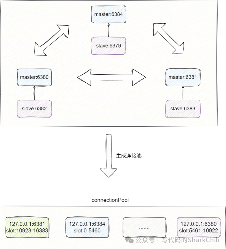 后续程序进行读写操作时都以此为基础进行通信,具体读者可参考笔者上述redis集群操作的工具JedisCluster