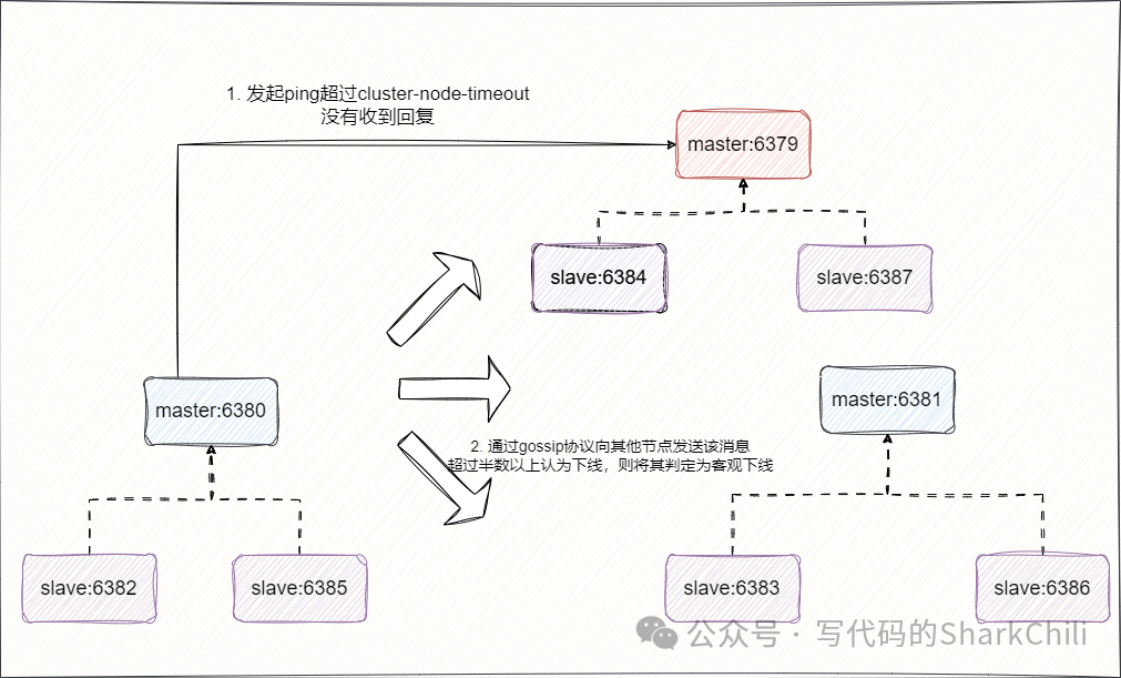 配置的时间内没有收到消息,就会将其标记为主观下线,随后该节点就会基于gossip协议发送询问其他节点对于该节点状态的判断,超过半数以上认定下线后,该节点就会被认为客观开始,开始故障转移流程: