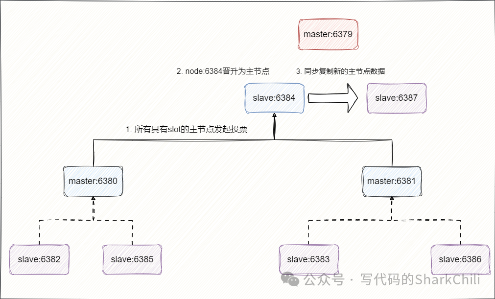 选举新的主节点之后,故障转移就完成了,没选举上的从节点就会同步复制该主节点的消息: