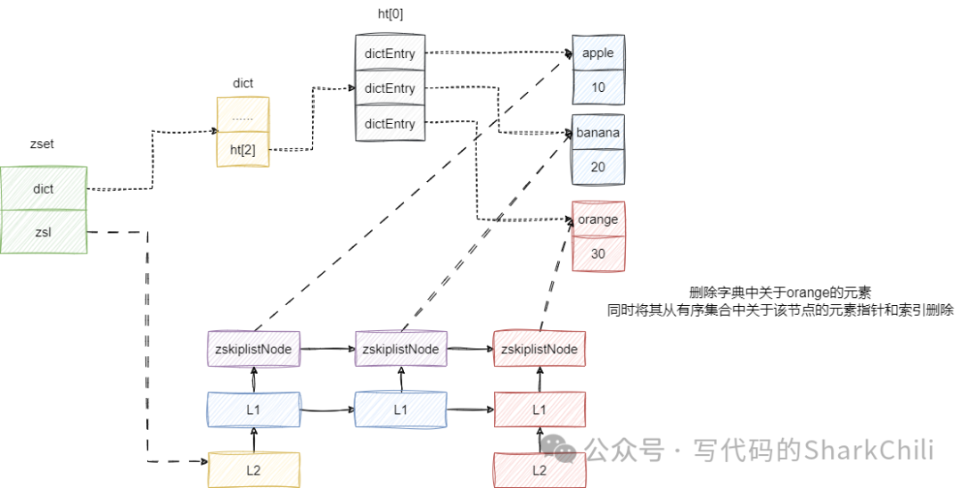 当有序集合删除元素时,除了将该元素从字典中移除,还需要将跳表中关于该元素的指针和索引全部移除,如下图,假设我们要删除orange
