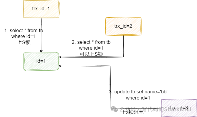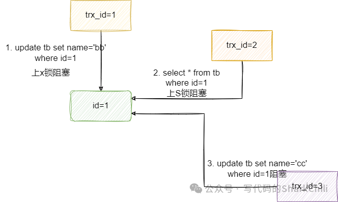 :又称写锁,进行修改操作前就需要上一把X锁,上了写锁的数据,其他事务则无法上读锁或者写锁。对于已经上了读锁的数据,写锁自然也是不能上锁的。