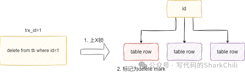 操作进行一定的拓展,当事务进行delete的操作时,对应的步骤为: