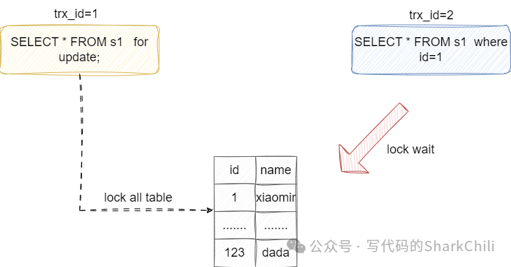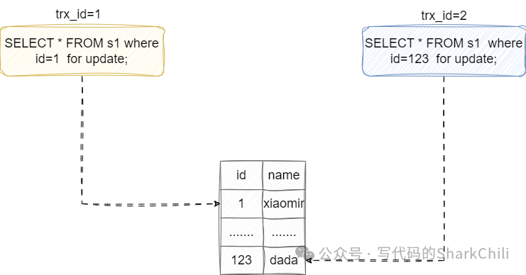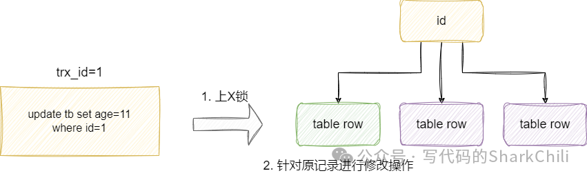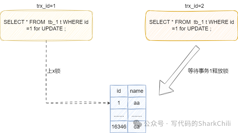 如下图这个说明,假设的我们的事务1先针对id为1的值上了一把写锁,对应事务的SQL如下:
