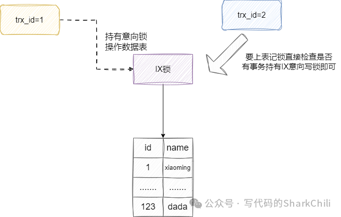 ,这样某些事务需要上全表锁时,只需要看看有没有事务持有意向锁即可: