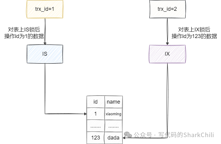 之间互相兼容,彼此不互斥,例如:一个事务上了IS,其他事务同样可以上IS和IX,因为IS本质就是一个共享读锁,某个事务持有这个IS锁之后上的可能是id为1的读锁。不影响其他事务上IS或IX后对id为2的数据上X锁: