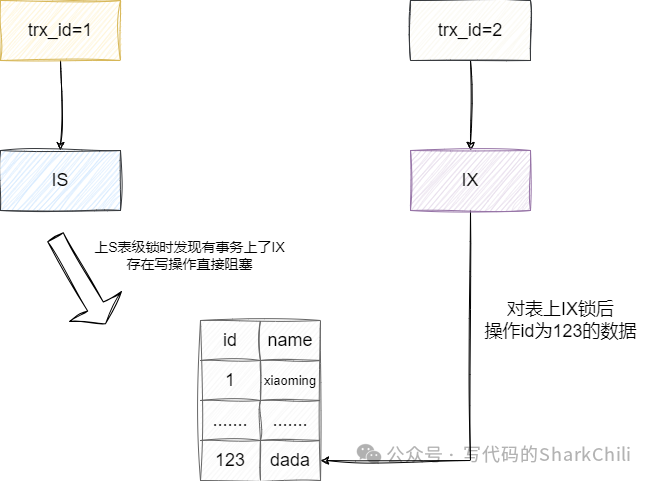 接下来我们从表记锁的角度探讨以下意向锁和读写锁之间的关系,假设我们的事务需要上IS锁之后针对表上了S表级锁,那么就需要查看是否有事务上了IX锁,如果有则说明有事务正在进行写操作,此时我们的S表级锁操作就会阻塞: