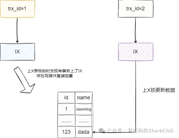 同理假设我们的尝试IX锁进行修改操作,需要针对全表上了X锁,此时我们就需要检查是否有其他事务上了IS或者IX以确定是否存在数据操作,如果有则阻塞等待,这就是IS、IX锁对于数据读写操作的巧妙设计: