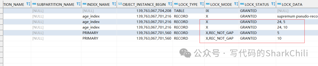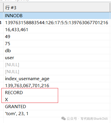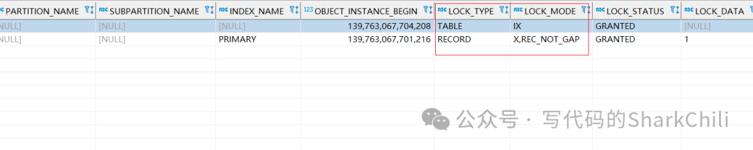 表,可以看到这条该事务上X锁前上了一把IX锁之后,针对这条记录上了X,REC_NOT_GAP