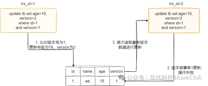 最先执行,这就使得右边的更新失败了,这样右边的事务就知道自己更新条件数据已过期,就会修改版本号再次进行更新。