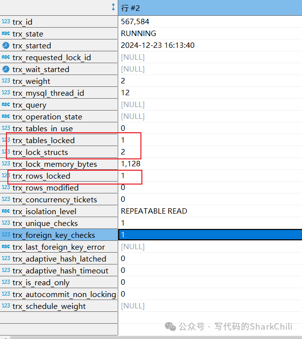 在正式演示死锁定位与排查思路之前,我们先简单介绍几张比较重要的表,首先是INNODB_TRX 这张表,它会记录当前活跃事务所持有的锁的情况: