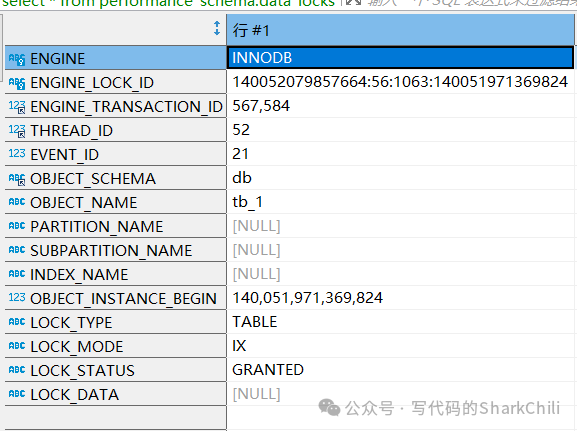 事务的线程号、事件id以及这个事务在tb_1表上了一把IX意向读锁: