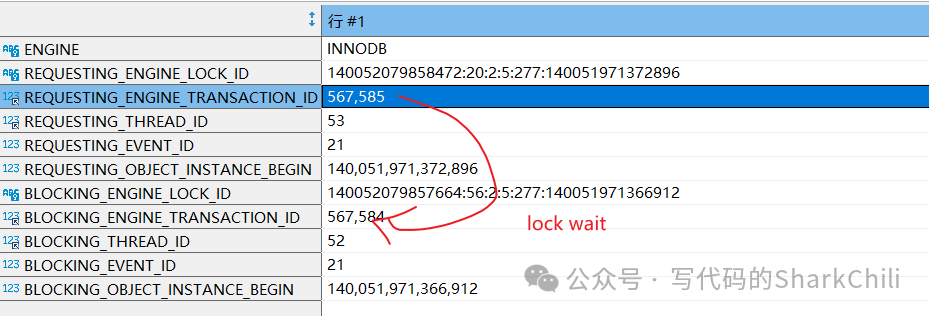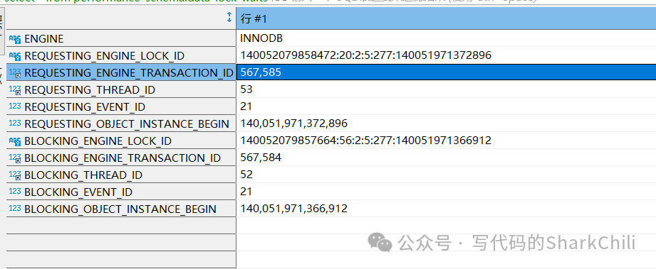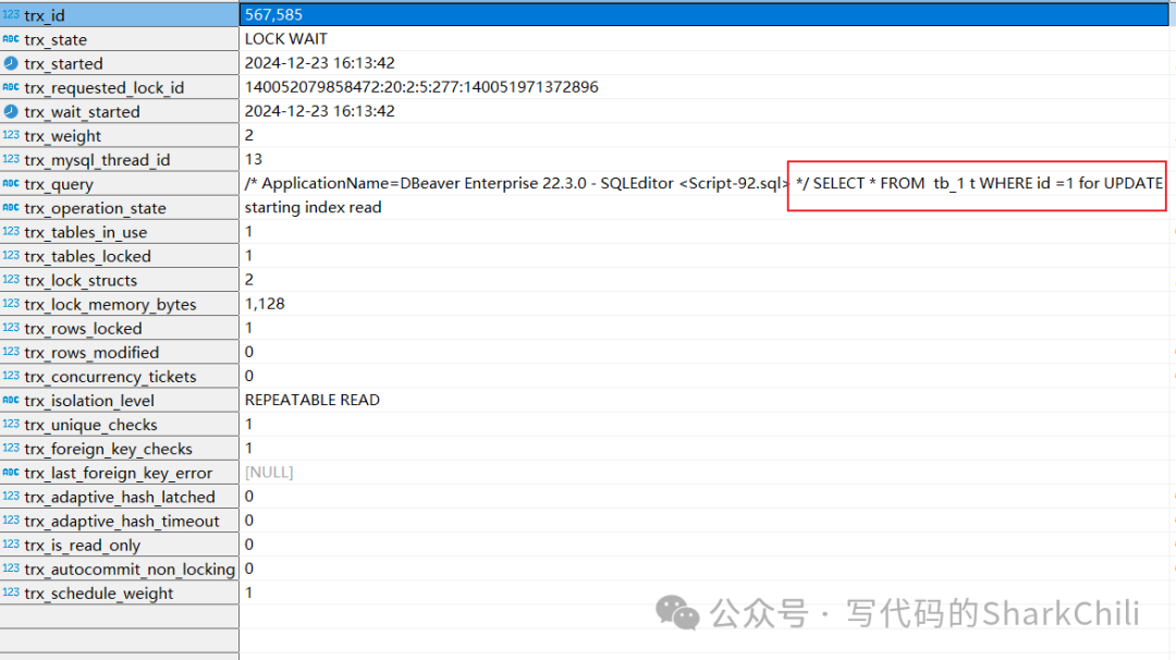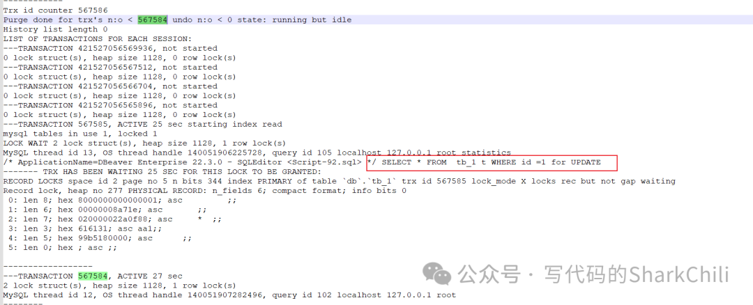 可以看到我们本次SQL的食物号为567585它处于锁等待状态,可以看到它正在执行的SQL语句以及上锁的信息
