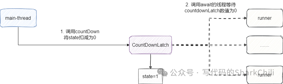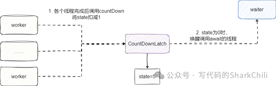 我们以等待所有工人完成工作的例子进行解析,实际上在CountDownLatch