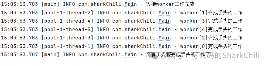 对应的我们也给出输出结果,可以看到主线程在线程池线程完成后才输出: