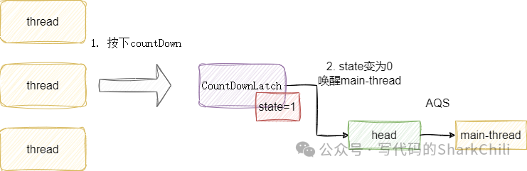 为倒计时门闩,它主要用于需要某些条件下才能唤醒的需求场景,例如我们线程1必须等到线程2做完某些事,那么就可以设置一个CountDownLatch
