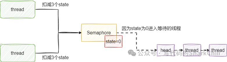 信号量多用于限流的场景,例如我们希望单位时间内只能有一个线程工作,我们就可以使用信号量,只有拿到线程的信号量才能工作,工作完成后释放信号量,其余线程才能争抢这个信号量并进行进一步的操作。 对应我们给出下面这段代码,可以看到生命信号量数值为6,每当线程拿到3个信号量之后就会执行业务操作,完成后调用release