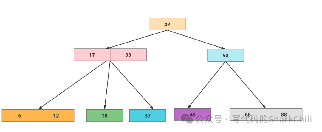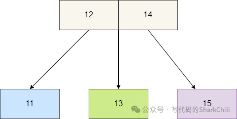 同理我们再给出3节点的图例,可以看出3节点的就是由两个节点拼接成的节点,其左中右分别可以挂一个子节点,由此我们才称它为3节点。